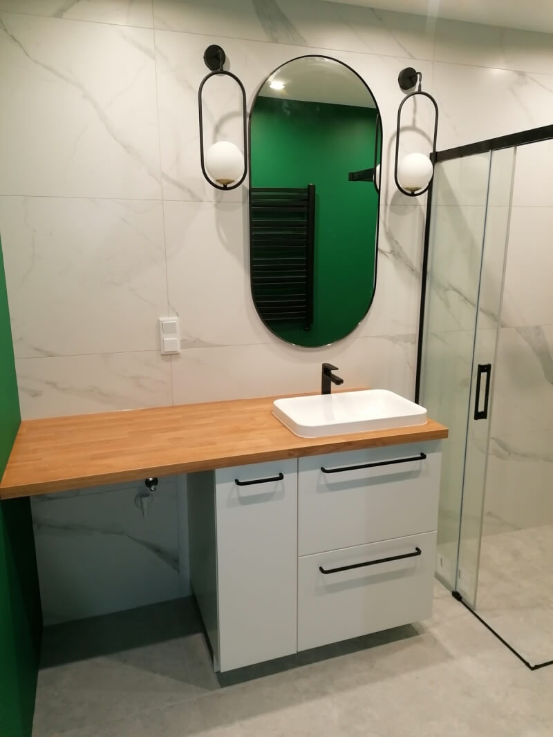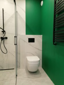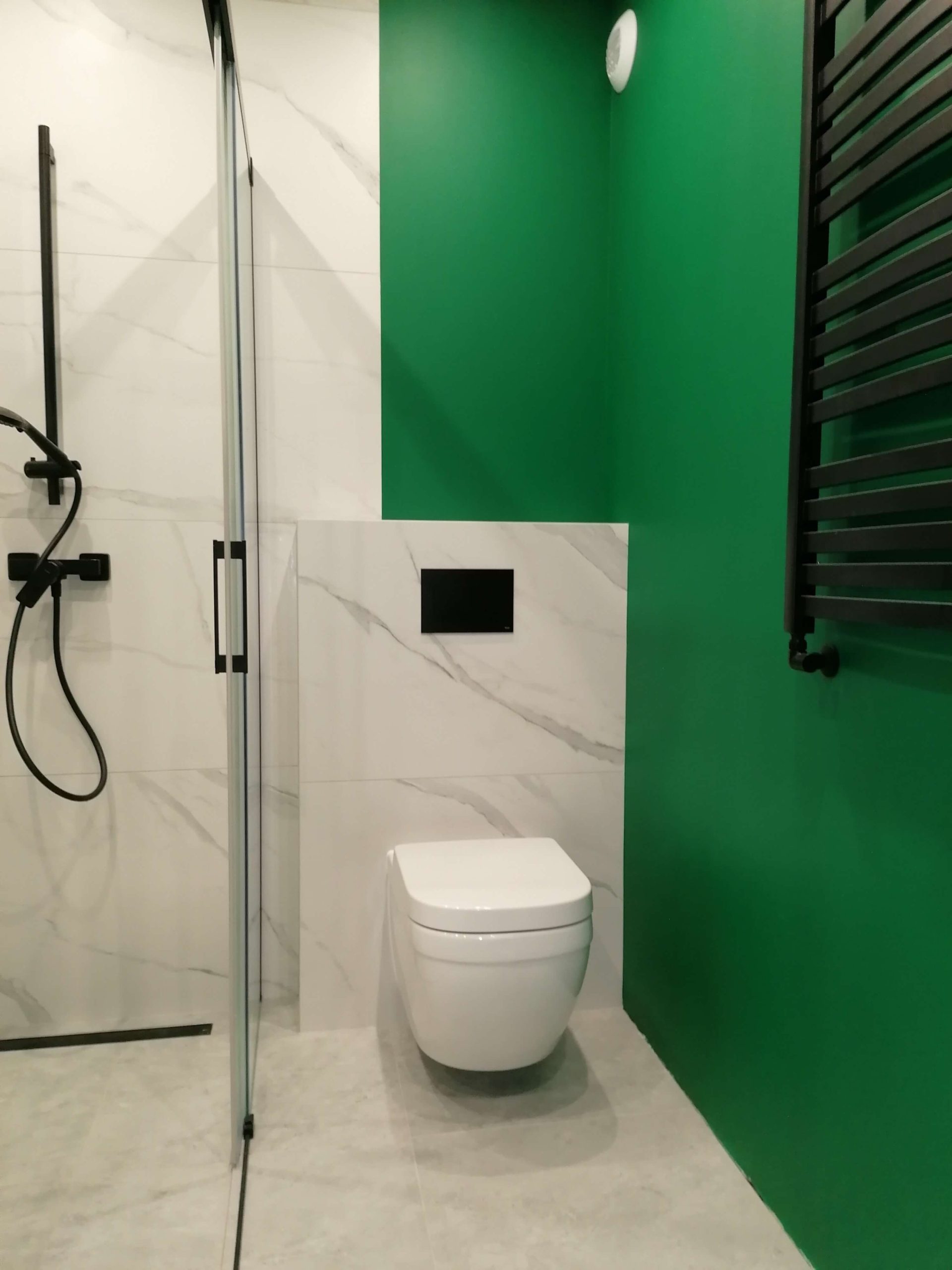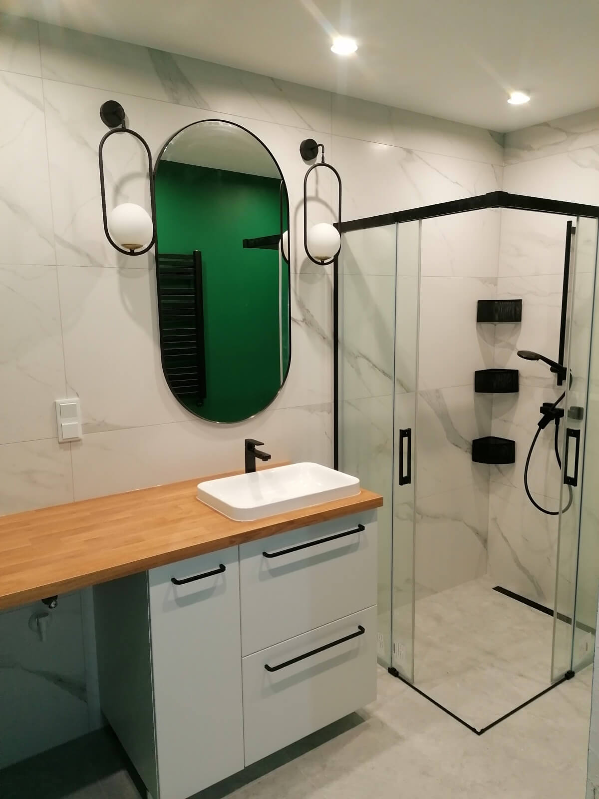 Łazienka zrealizowana we Wrocławiu.Pomieszczenie było w stanie deweloperskim.Pracę rozpoczęliśmy od przeróbek hydraulicznych i elektrycznych , podwieszenia sufitu z płyty GK i zabudowy zestawu podtynkowego toalety . Wykonaliśmy montaż odpływu liniowego, położyliśmy glazurę . Zainstalowaliśmy prysznic, toaletę, oświetlenie i wyposażenie łazienki. Kompleksowe wykonanie od a do z.
