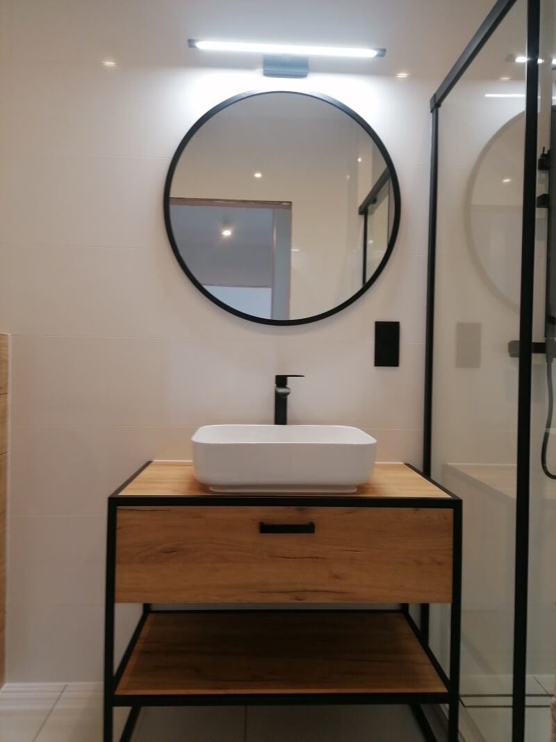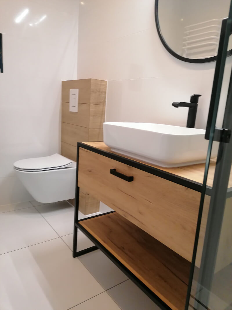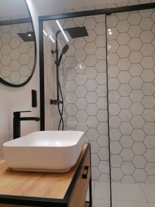 Każdy projekt wymaga przeróbek hydraulicznych i elektrycznych tu nie było inaczej. Po przygotowaniu pomieszczenia położyliśmy glazurę , zamontowaliśmy brodzik i kabinę prysznicową oraz oświetlenie i szafkę wraz z umywalką.