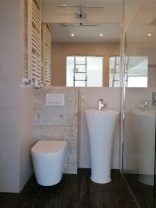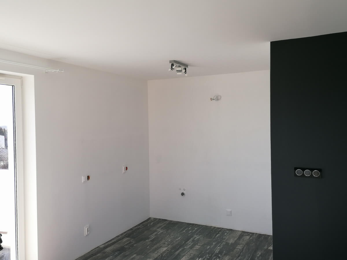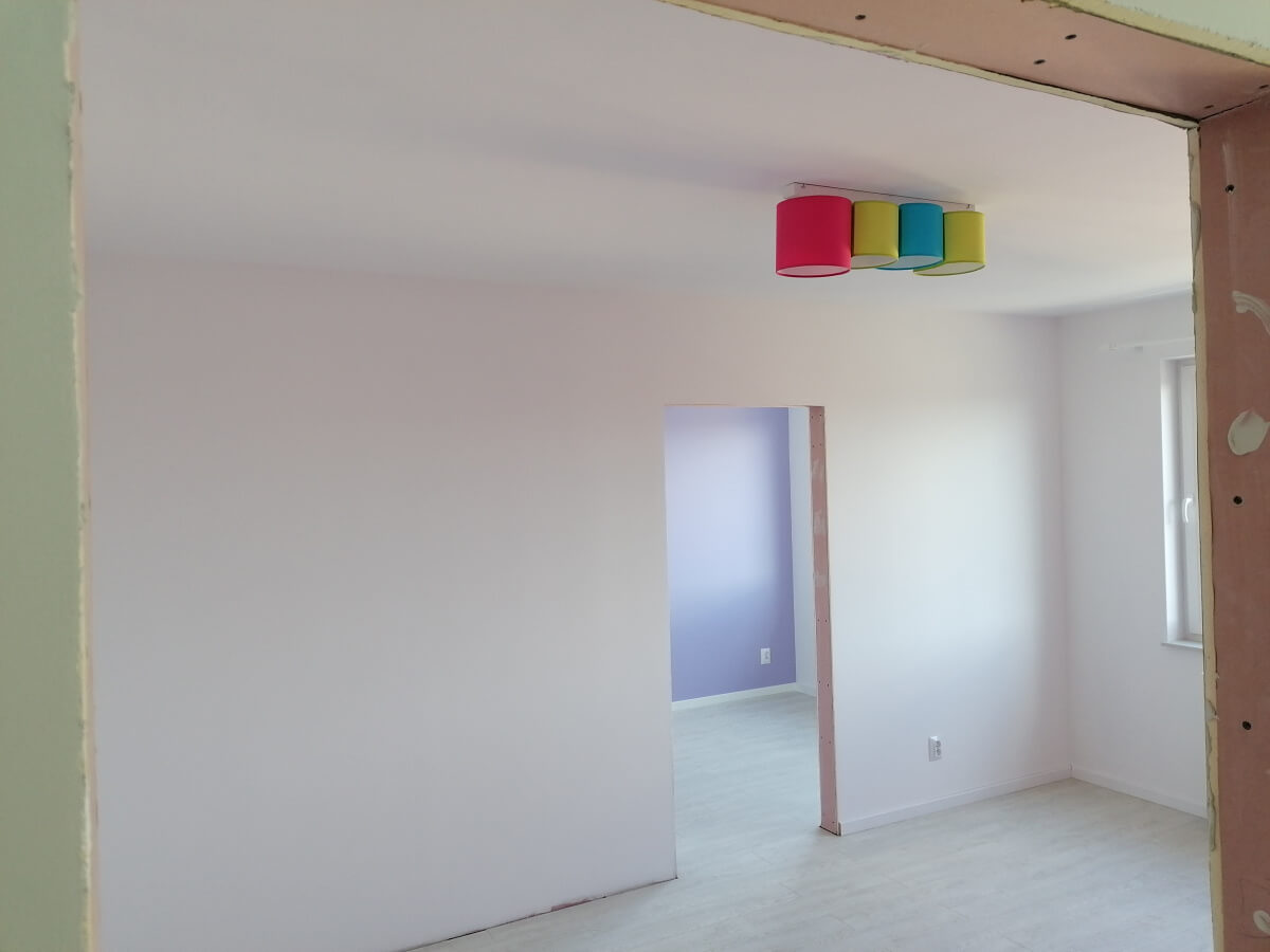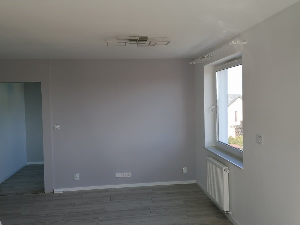 Mieszkanie odebraliśmy w stanie deweloperskim nasza usługa polegała na wygładzeniu ścian we wszystkich pomieszczeniach, przygotowaniu pod malowanie i pomalowane pomieszczeń , wykonaniu łazienki (począwszy od przeróbek hydraulicznych i elektrycznych, położenie glazury, po montaż wyposażenia łazienki). Położyliśmy panele i listwy przypodłogowe. W każdy pomieszczeniu zamontowaliśmy oświetlenie.